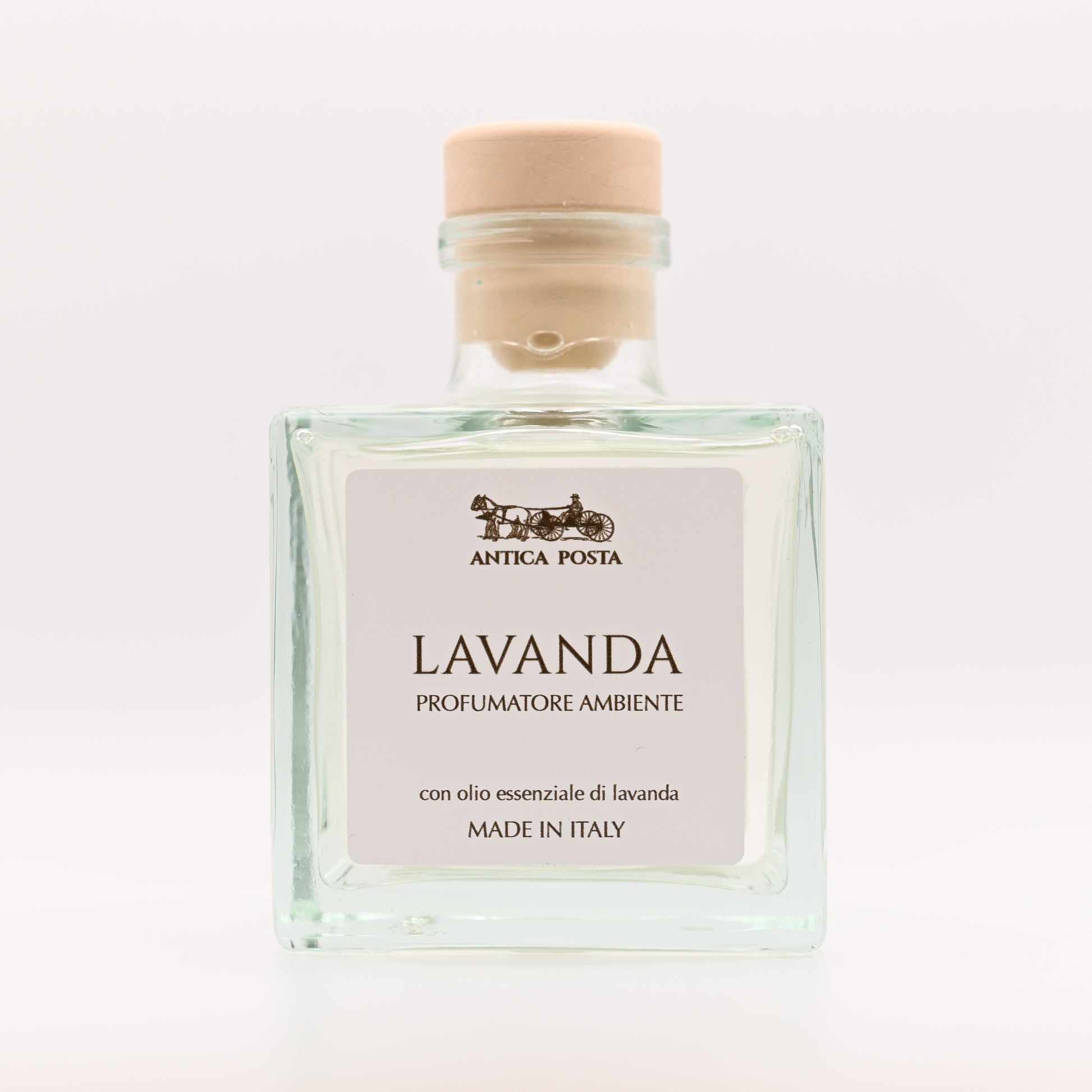 Profumatore ambiente con olio essenziale di lavanda. Bastoncini in midollino per permettere la