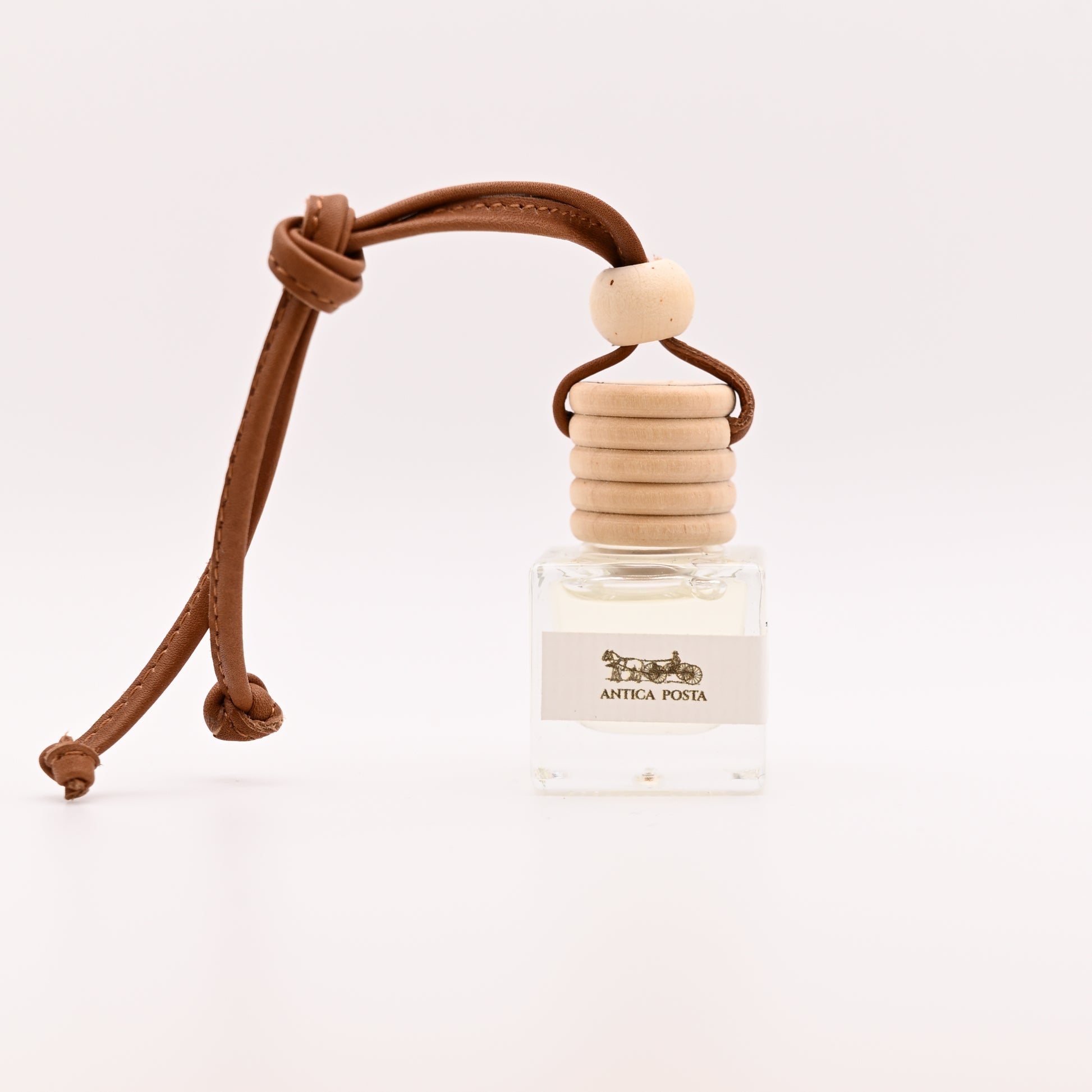 Boccetta in vetro con tappo in legno e cordino in vera pelle.